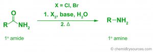 تفاعل لصناعة الأمينات الأولية من الأميدات باستخدام البروم أو الكلور و هيدروكسيد الصوديوم :