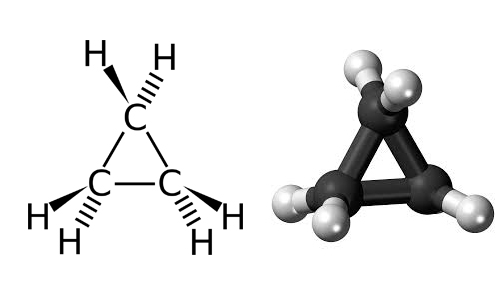 1. In strained-ring compounds the angles assumed on the basis of hybridization are often not equal to the angles obtained by joining the atomic centers. In these cases it is sometimes assumed that the bonding orbital is bent or banana-like in shape. Cyclopropane is an example, in which geometric considerations imply a bond angle of 60° while sp³ hybridization implies an inter-orbital angle of around 100°, giving a banana bond.